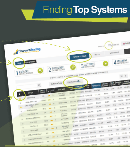 You can log into the trading system portal to see all tracked systems. The customizable performance table lists and sorts systems across profit and loss, required capital, ranking, and dozens of additional factors. You will be able to browse all systems, top 10 tables, and also your current active systems. You can use quick filters to find top systems, or build your own advanced filter logic across dozens of metrics.